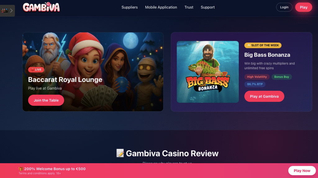 Gambiva features over 1,000 games including slots, live dealer games, and interactive game shows from leading providers like Pragmatic Play and Evolution Gaming.